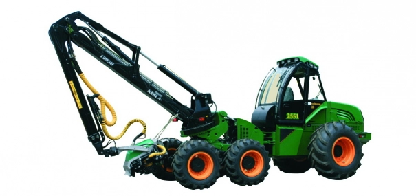 Харвестер «АМКОДОР 2551» обладает повышенной проходимостью благодаря гидростатической трансмиссий. Харвестор предназначен для валки деревьев, обрезки сучьев и раскряжевки на сортименты заданной длины, является самой сложной технически машиной модельного ряда лесной техники холдинга. Финская харвестерная головка Kesla Foresteri 25RH позволяет спиливать деревья диаметром до 670 мм, а если подпил ствола осуществляется опытным оператором сразу с трех сторон, то возможна валка деревьев диаметром до 780 мм. Затем харвестерная головка удаляет сучья и раскряжевывает ствол на сортименты заранее заданной длины с точностью +/- 2 см. На машине устанавливается стелящийся манипулятор Foresteri 1395H финского производства с вылетом стрелы в 9,5 м и с углом поворота в 260, что позволяет осуществлять заготовку древесины на большой площади без перемещения машины. За 8-часовую смену оператор может заготовить до 300 м3 лесоматериалов согласно испытаниям, при этом средняя производительность на спелом лесе − 20−30 м3 / ч. Расход топлива составляет 0,6−0,7 л / м3 при объеме дерева 0,4−0,5 м3.
