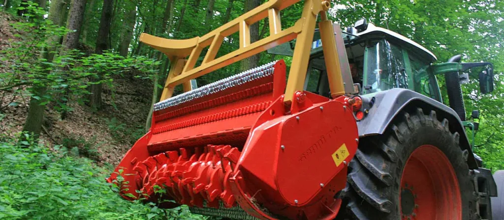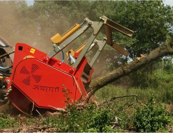 Доступны разные типы рамки-толкателя — механические, гидравлические с когтями с граблями или без — для валки деревьев, а также для защиты трактора. Мульчер срезает и измельчает деревья, кусты и ветки диаметром до 30 см. Доступные рабочие ширины: 200, 225, 250 см.