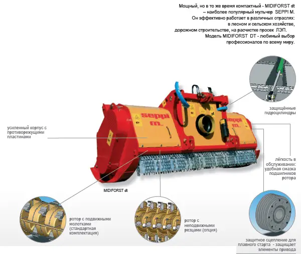 Благодаря ротору новейшего поколения, запатентованному, корпусу из специальной износостойкой стали, ротору с твердосплавными резцами MINI DUO™, MIDIFORST срезает и измельчает древесины в диаметре до 25 см, на рабочей скорости до 5 км / ч. Долгий срок службы мульчеров гарантируют прочный корпус, центробежное сцепление для плавного старта и защиты карданного вала, хорошо защищённые гидроцилиндры, защитные цепи. Высокая производительность мульчера обеспечена благодаря ротору с неподвижными резцами со сменными шейками и 3-ём рядам закалённых противорежущих пластин. Доступные рабочие ширины: 175, 200, 225 см.