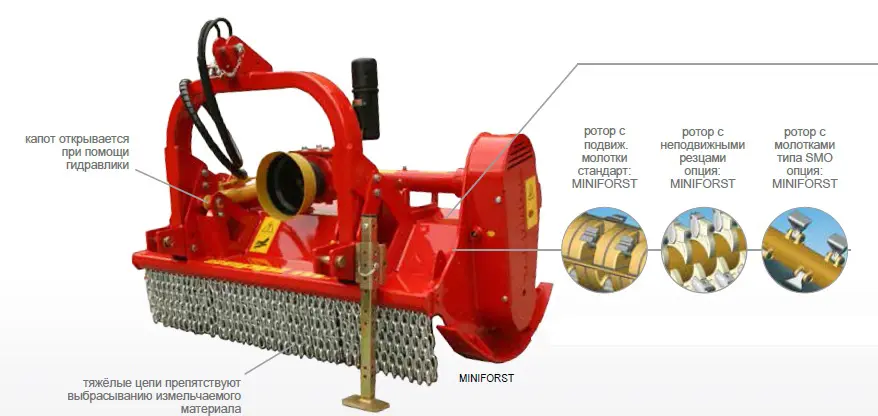— лесной измельчитель-кусторез-косилка MINIFORST — небольшой мульчер для работы на тракторах мощностью 60-100 л.с., предназначен для измельчения растительно-древесных диаметров до 0,12 м;