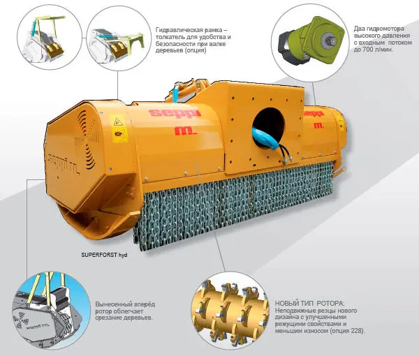 — высокопроизводительной машиной SUPERFORST , предназначенной для работы на мощных тракторах 230-390л.с., рассчитанной на растительно-древесные диаметры до 0,4 м;